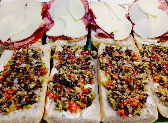To Make Sandwiches: Cut loaves of bread in half horizontally; hollow out some of the excess bread to make room for filling. Spread each piece of bread with equal amounts olive salad, including oil. Layer 'bottom half' of each loaf with 1/2 of the salami, ham, mortadella, mozzarella and Provolone. Replace 'top half' on each loaf and cut sandwich into quarters.